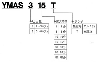 形式記號 | 間欠時間 (分) | 吐出量 (c?/cy) | 最大吐出圧 (MPa) | 吐出口徑 (Rc) | モーター出力 (W) | タンク容量 (?) | 有効容量 (?) |